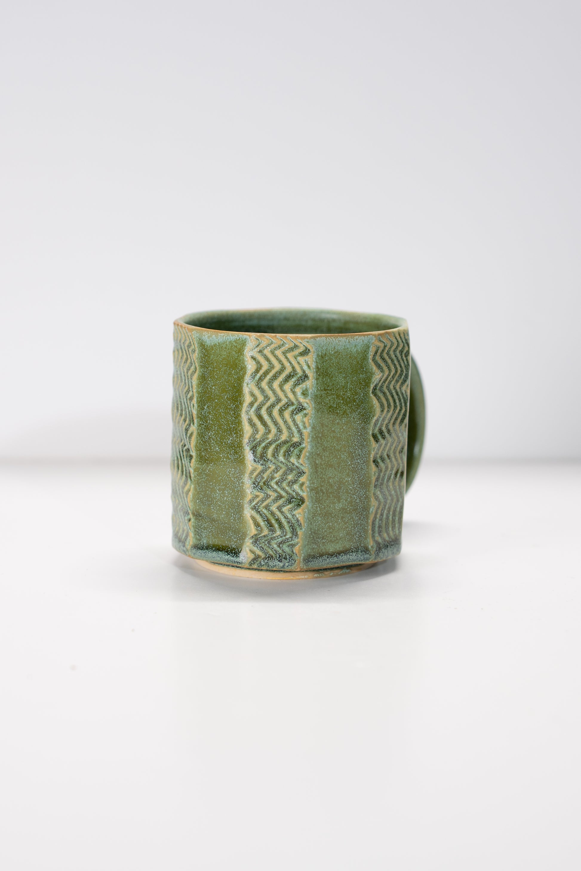 The faceted mugs are my favourite forms. The hand feel experience is always enjoyable and unique. an added layer of texture is added through a tightly coiled wire being stretched out and used to cut every second facet.