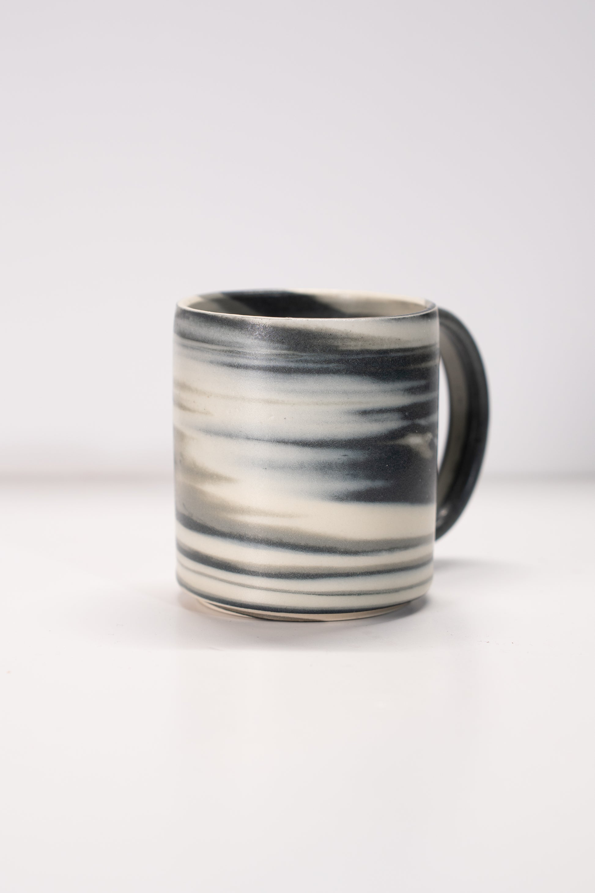 This electric fired porcelain-stoneware hybrid clay based mug has been blended with various stains to achieve multiple levels of greys. By stacking and layering the colored clay in various patters I achieve a unique cup every time.