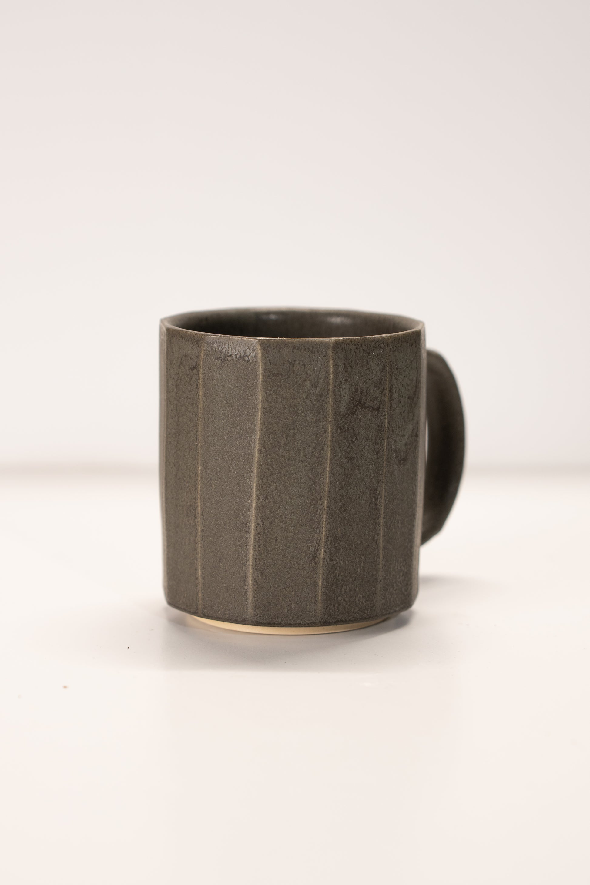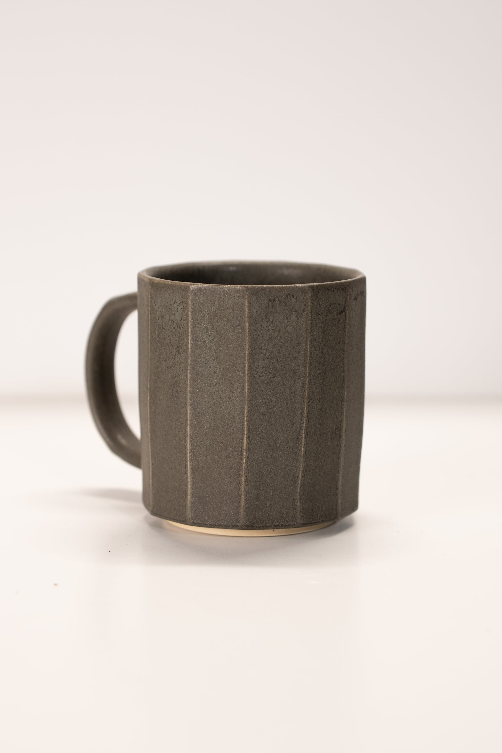 these faceted black mugs are soft in the hand. a great pairing with the flat edges and the soft glaze.